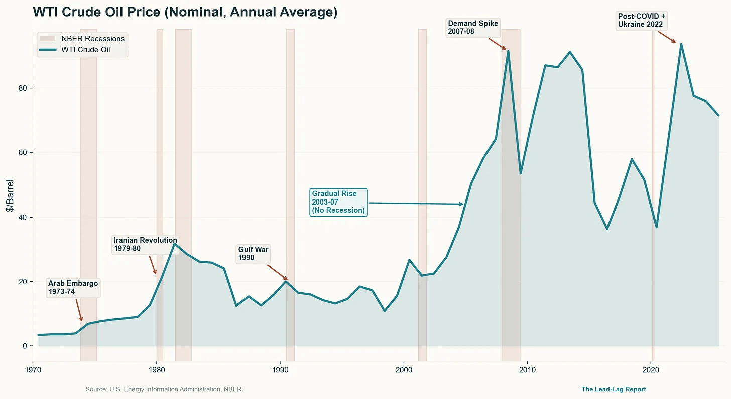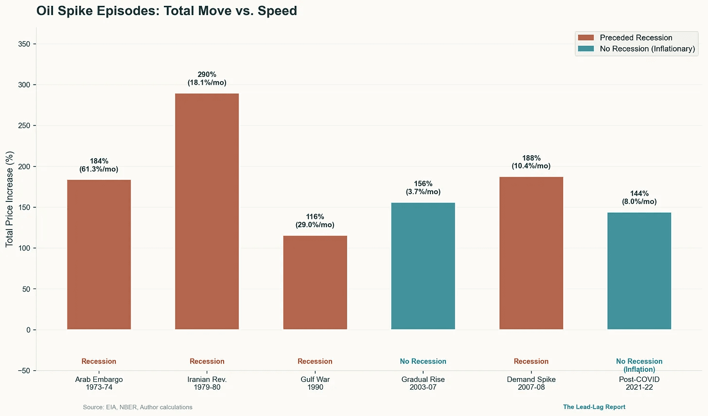 Sharp spikes (especially 50%+ moves in a short window) have historically accelerated the shift from late-cycle strain to outright contraction, acting as a tipping-point accelerant for fragile economies. St. Louis Fed data shows that before the 1973–75, 1980, 1981–82, and 1990–91 recessions, real energy prices surged an average 17.5% in just four quarters, each driven by rapid, concentrated jumps rather than slow grinds.