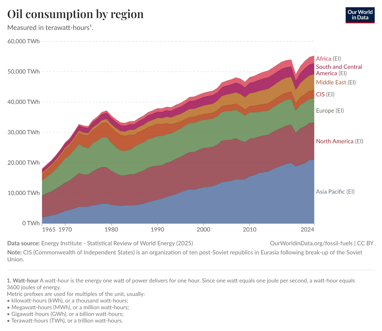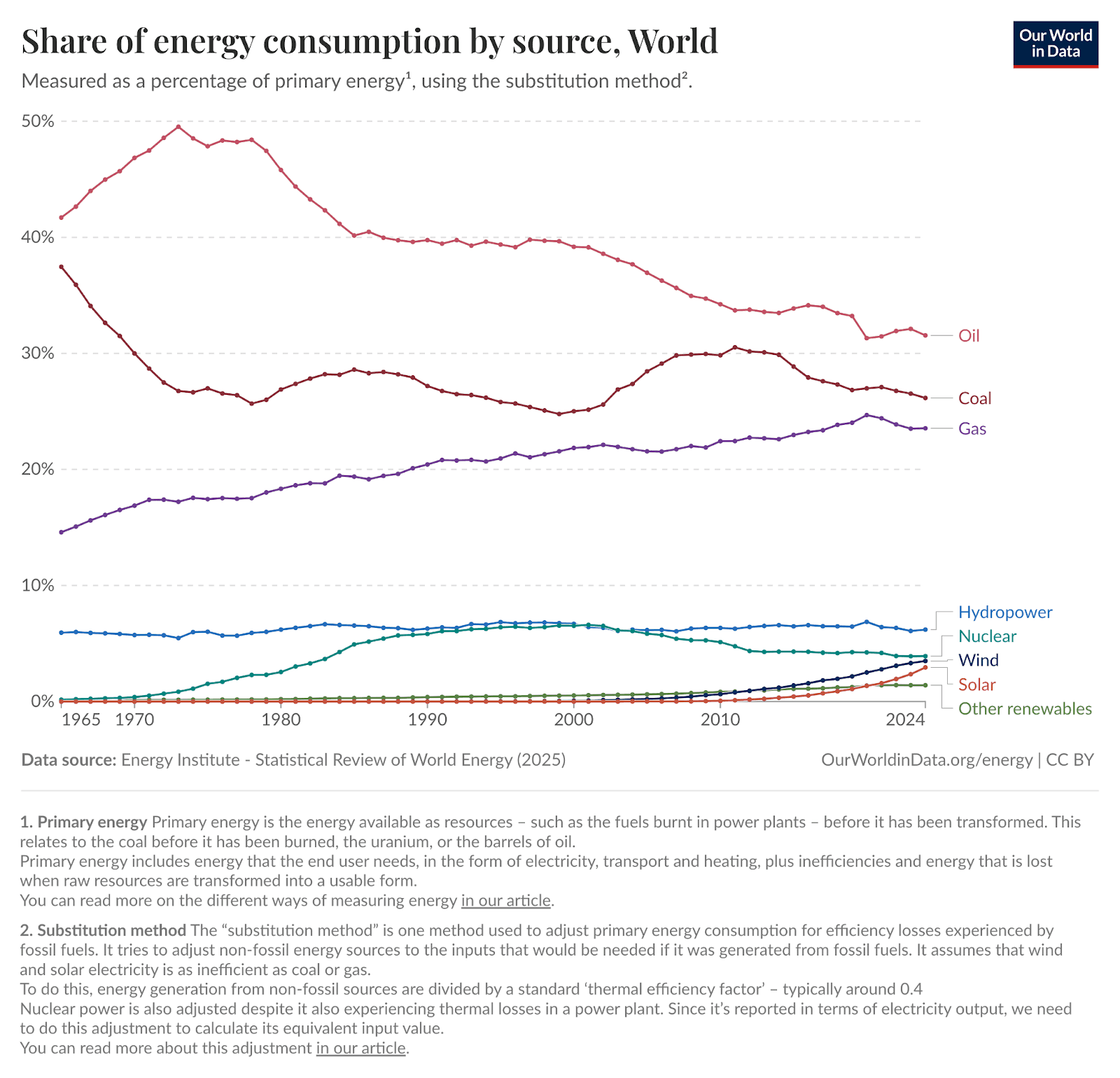 Even though oil’s share of total energy has fallen from 46% to ~30%, the actual volume consumed has more than tripled over 60 years because global energy demand overall has exploded.